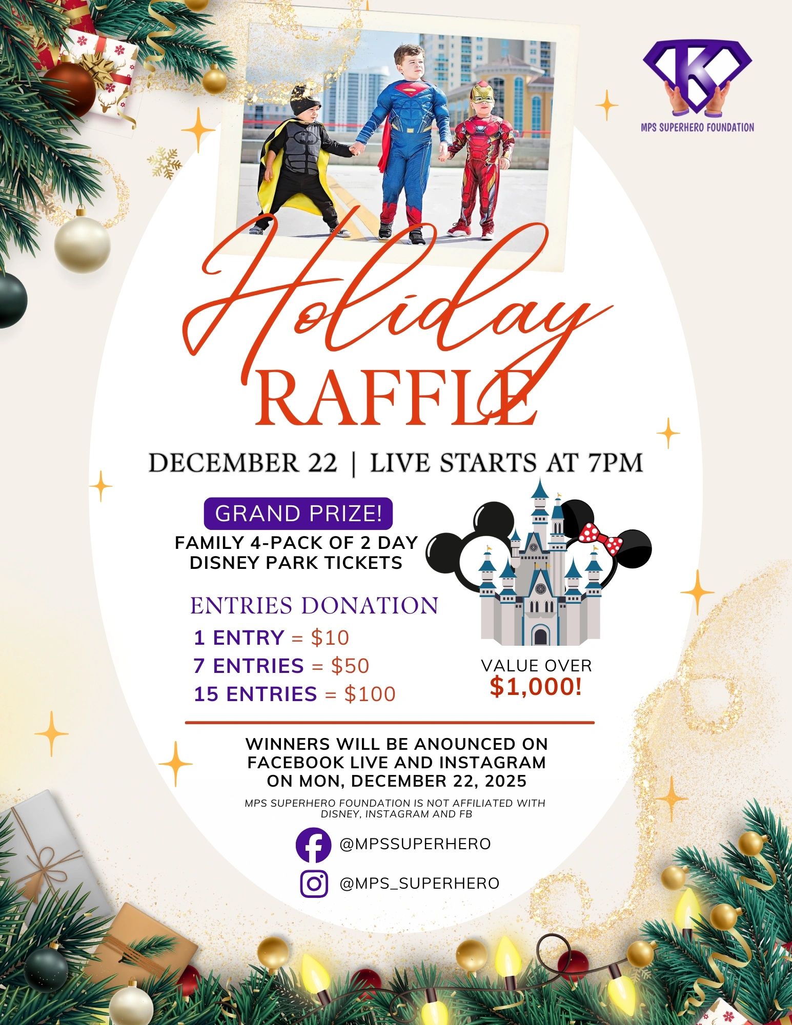 Join the MPS Superhero Foundation for our Holiday Raffle on December 22, with a live stream starting at 7 PM on Facebook and Instagram! This special fundraiser gives supporters a chance to win an amazing Grand Prize: a family 4-pack of 2-day Disney Park tickets, valued at over $1,000!